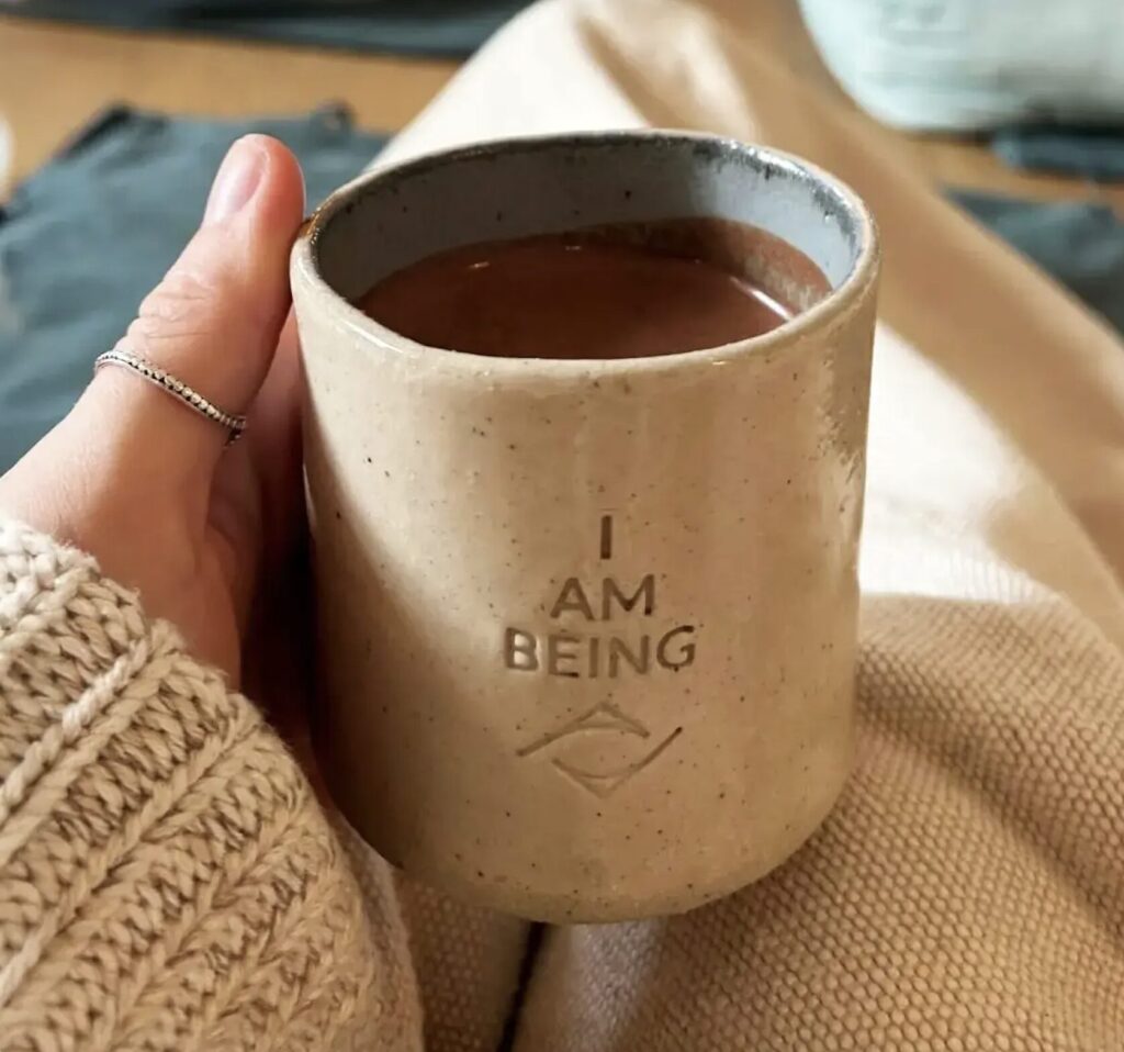 These handmade ceramic cacao cups are lovingly crafted from stoneware, each one unique. Built by hand around a tubular form, stamped with the I AM BEING imprint, and carefully smoothed, they are slowly dried for a week to prevent warping or cracking. After a bisque firing at 1000°C, they are glazed in your choice of two intentional colours and fired again at 1200°C, making them durable, food-safe, and dishwasher-friendly. Perfect for cacao ceremonies, rituals, or mindful daily moments, each cup is a gentle reminder to turn inward, return to yourself, and open your heart as you sip.